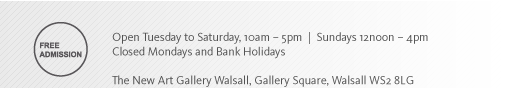 Ceri Hand Bob And Roberta Smith Cedar Lewisohn Deborah Robinson Zoe Lippett Fiona Venables Deirdre Figueiredo Harun Morrison Biographies for each of the visitors are available on our website: www.tpwestmidlands.org.uk/studio-visits/ To apply, please visit www.tpwestmidlands.org.uk/studio-visits/ to download an application form. The deadline for all applications will be Friday 5 October. Further studio visits will be announced later in the year to take place in Spring 2013. For more information about the artist development programme run by The New Art Gallery Walsall, supported by Turning Point West Midlands, please click the link below: ....................................................................................................... Also at The New Art Gallery Walsall, a series of artists' talks to support the forthcoming exhibitions and the Artist Development programme: Harminder Judge Saturday 20 October, 2pm Fiona Rae Saturday 17 November, 2pm Jodie Carey Saturday 24 November, 2pm Book your free place in advance by calling 01922 654400. | ||